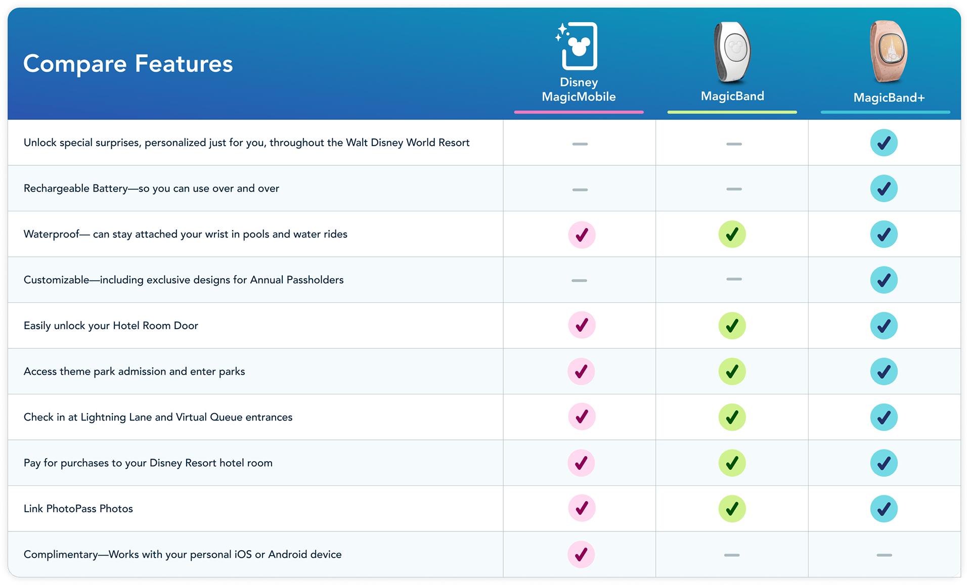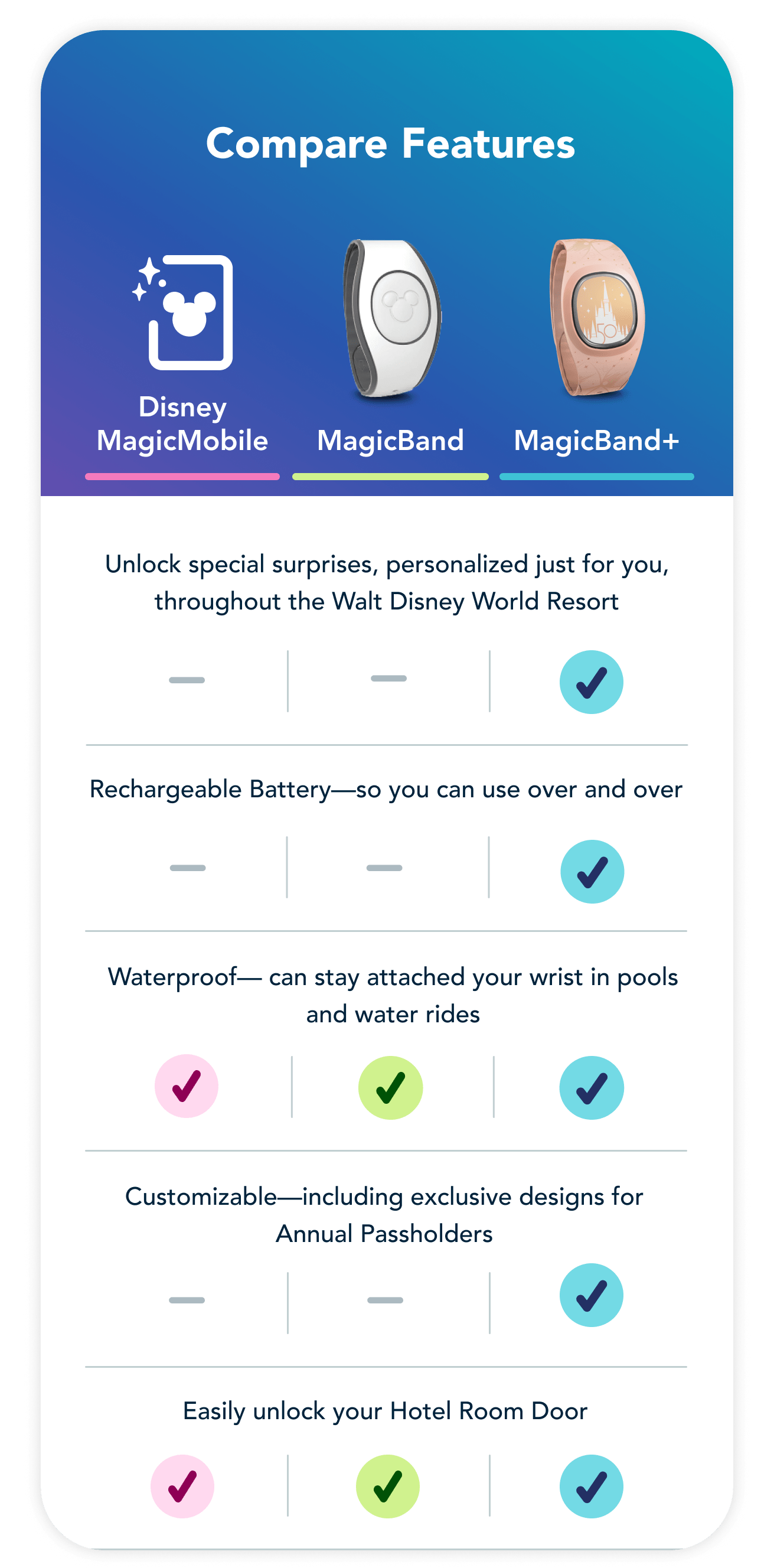 I designed a scalable web-based chart that has become the new standard chart design for Disney's design system. The version shown here highlights different features between the newest MagicBand+ and older versions of the product. My goals were to keep the chart on brand, clear, and flexible. Click here to see it live.
