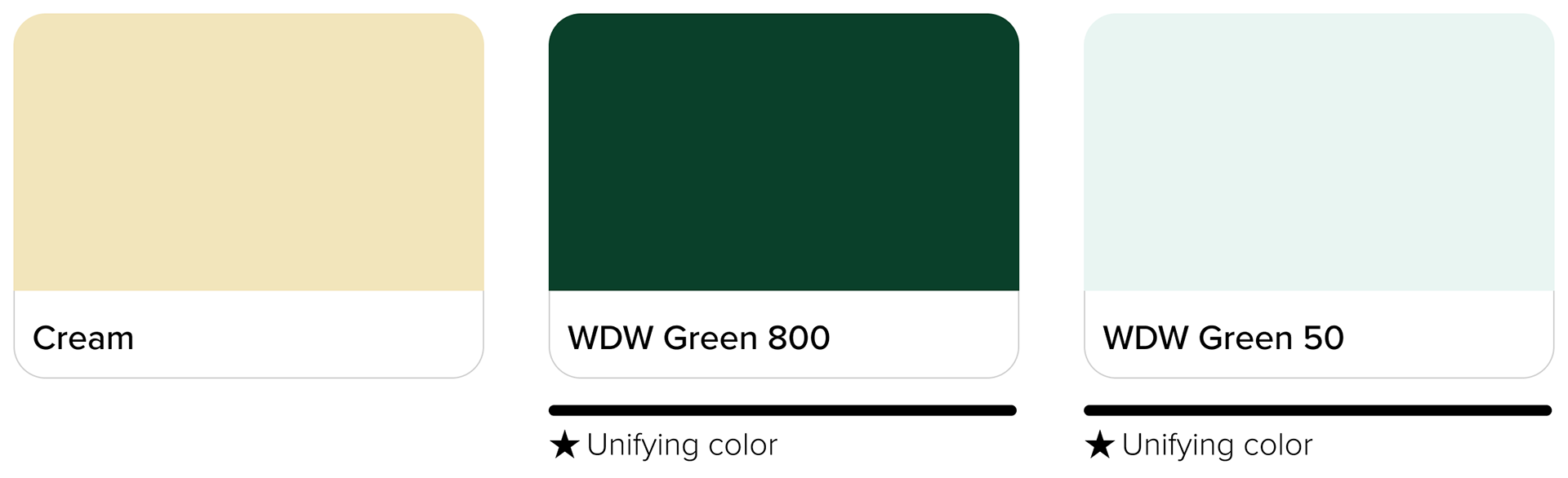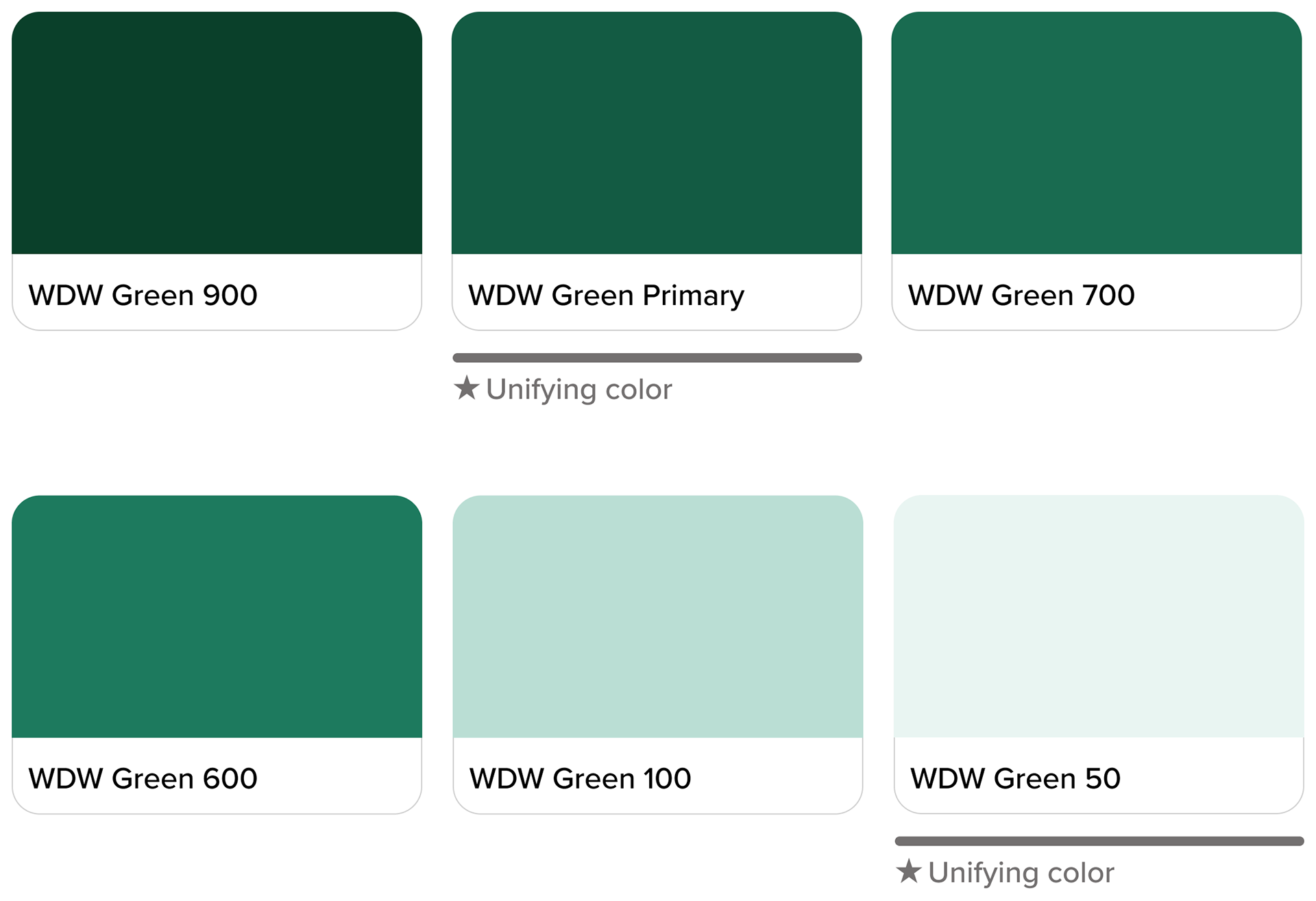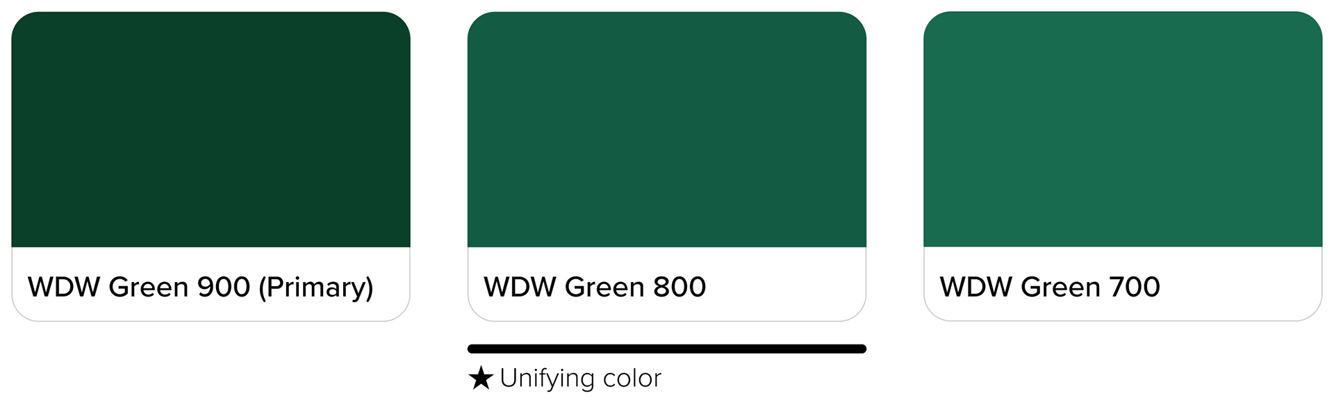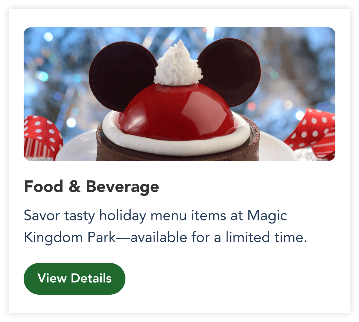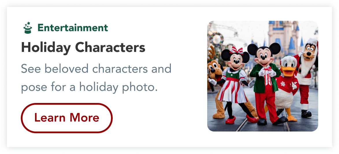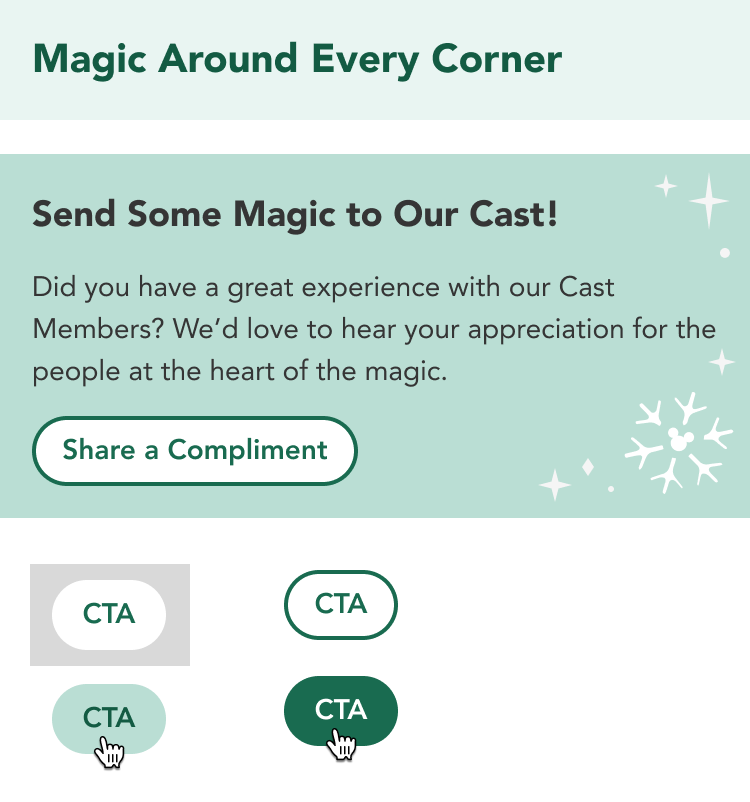 From the core brand colors of the WDW holiday style guide, I chose green as the foundational common color. I explored its tonal variations and found it versatile and accessible. Below are some components with this holiday branding applied.