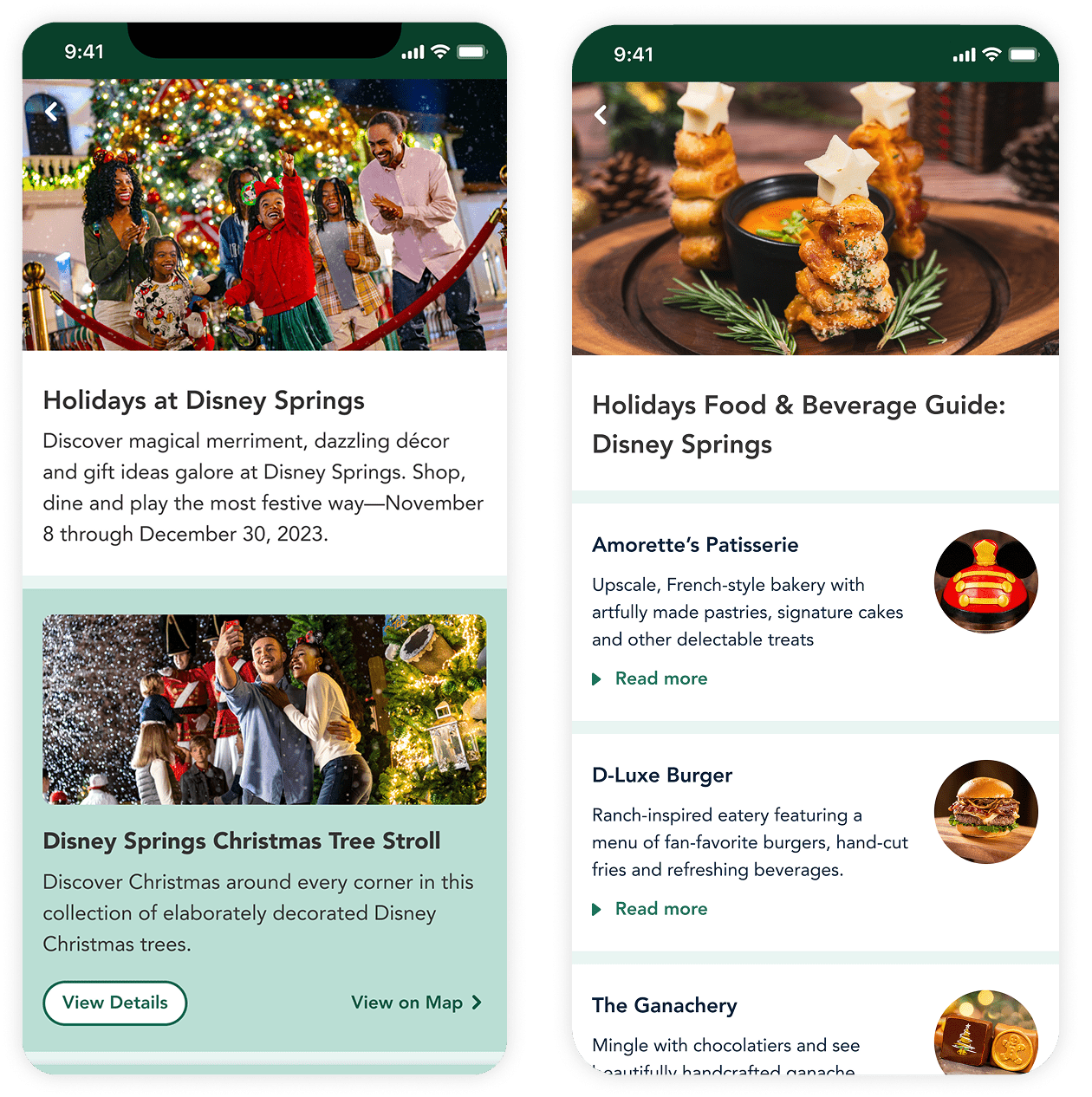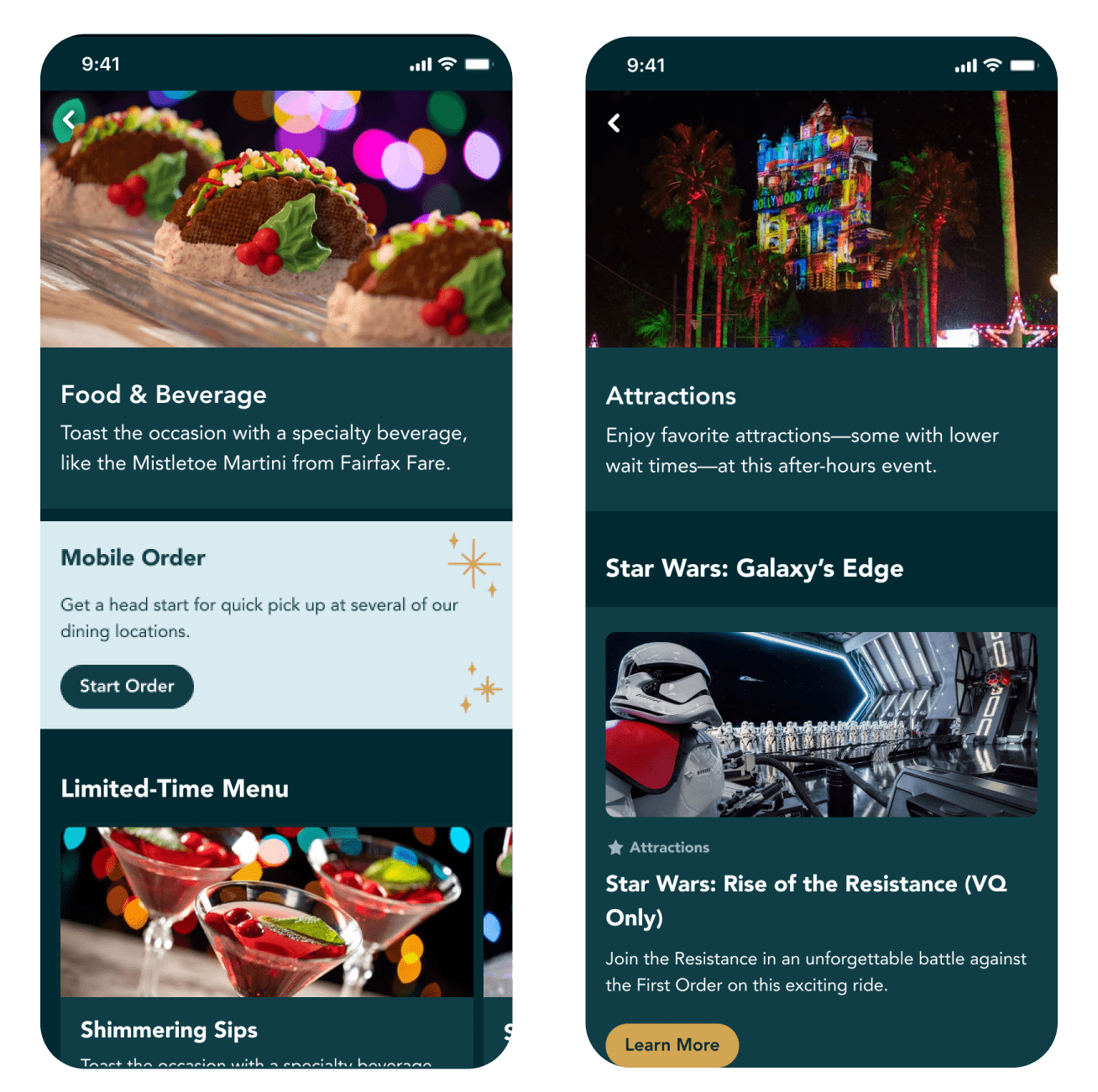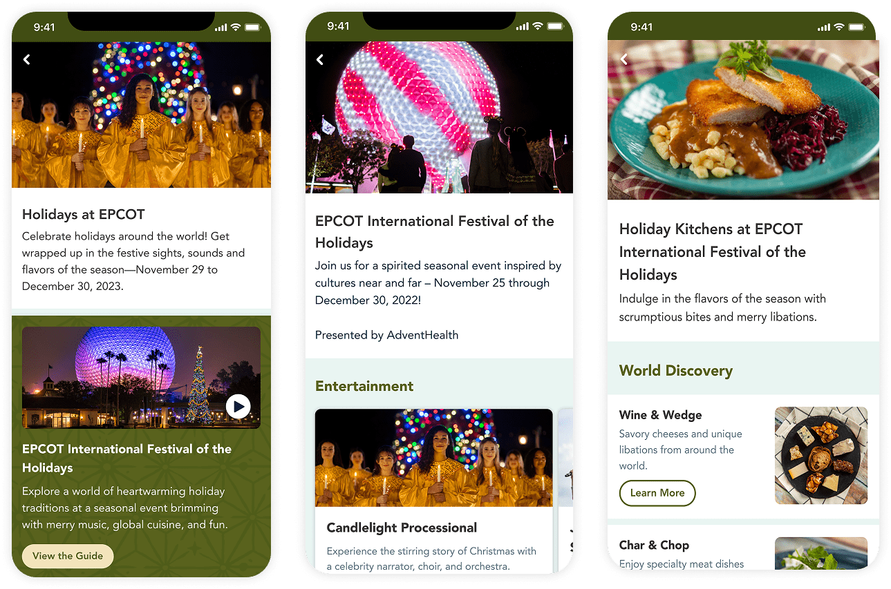 I accomplished this by finding foundations of the color system that worked with all brands and applied those core colors to consistent components across all screens. This created visual unity while still letting the individual brands stand out. The product was an in-app, consumer-facing holiday guide that was informative and also enabled ticketing and mobile food ordering.